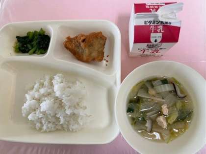 本日の献立は「たらフライ、すまし汁、小松菜のごまあえ、ごはん、牛乳」でした。