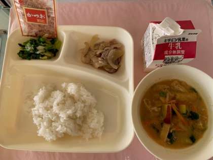 本日の献立は「豚肉のしょうが焼き、さつまいものみそ汁、なのはなのおひたし、ごはん、牛乳」でした。
