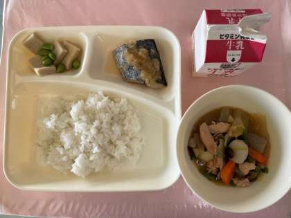 本日の献立は「さごしのおろしじょうゆかけ、さといもと野菜の含め煮、高野どうふの煮もの、ごはん、牛乳」でした。