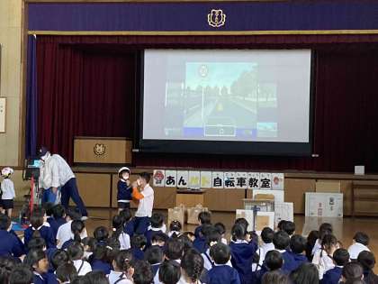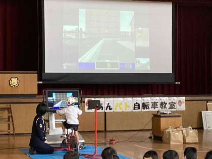 城東警察署の警察官による交通安全のおはなしのあと、自転車シュミレーターで安全な自転車の乗り方を学習しました。