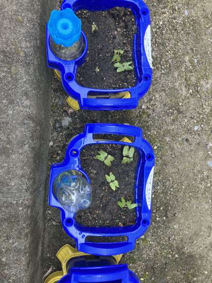 1年生が植えたあさがおの芽が出てきました。毎日、水やりをしています。