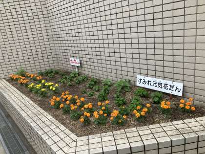 正門の花壇が華やかになりました。