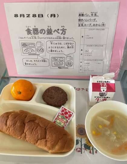 「焼きハンバーグ」は、製品のハンバーグを焼き物機で焼きます。ケチャップを1人1袋ずつ添えています。