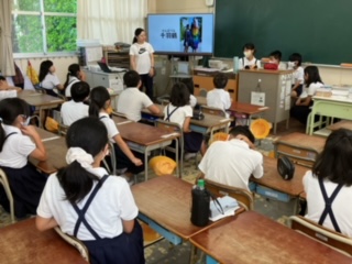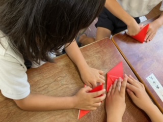 6年生がみんなに「おりづるの旅」の絵本を読んでくれました。そして、広島の修学旅行へ持っていく、平和の願いを込めたおりづるをみんなで折りました。