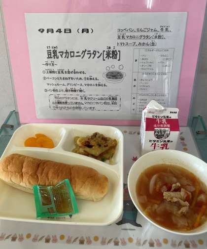 「豆乳マカロニグラタン[米粉]」は、主材にベーコンを使用した、小麦、乳製品を使わないグラタンです。豆乳特有のにおいを軽減したり、旨みを増したりするために、カレー粉、チキンブイヨンを使用しています。