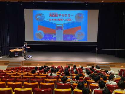 まずは、ホールの「アカデミー」で、飼育員さんから「生き物の環境への適応」について教わっています。