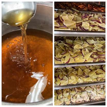「焼きさつまいもの甘みつかけ」は、焼き物機で焼いたさつまいもに、砂糖、塩、こいくちしょうゆで作ったタレを配缶時にかけます。
