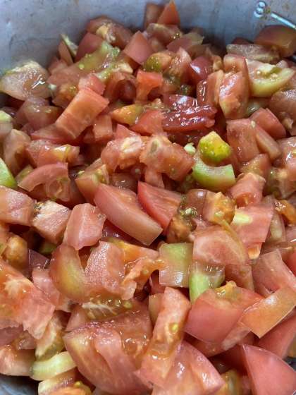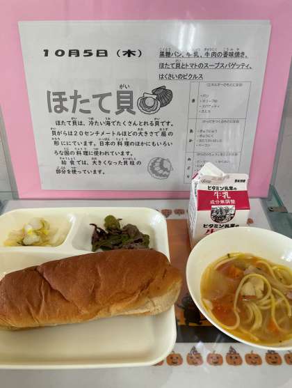 「ほたて貝とトマトのスープスパゲッティ」は、今月1回だけ使用できる生のトマトを使っています。オリーブ油でにんにくを香りよくいためて風味を増し、ほたて貝とベーコンで旨みを出しています。