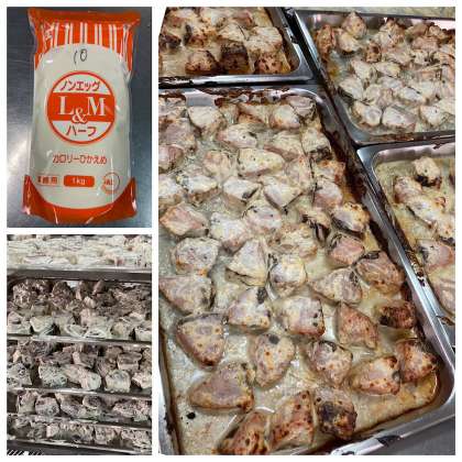 「かつおのガーリックマリネ焼き[ノンエッグドレッシング]」は、卵アレルギーのある児童も食べることができるノンエッグドレッシングを使っています。にんにく、塩、こしょう(白)、ノンエッグドレッシングで下味をつけたかつおを焼き物機で焼きます。