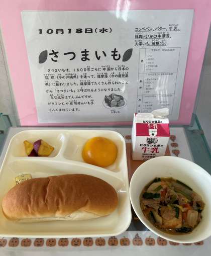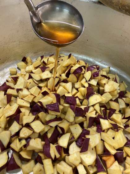 「大学いも」は、旬のさつまいもを油であげ、砂糖、塩、こいくちしょうゆで作ったみつをからめます。