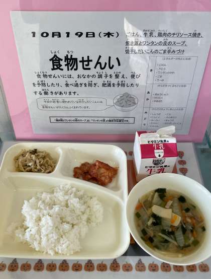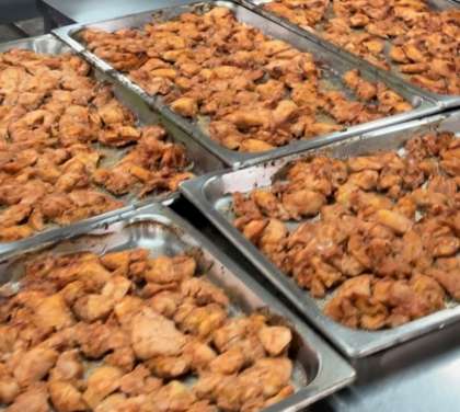 「鶏肉のチリソース焼き」は、鶏肉にしょうが汁、にんにく、砂糖、塩、こいくちしょうゆ、ケチャップ、トウバンジャンで下味をつけ、焼き物機で焼きます。