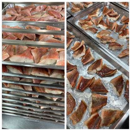 「あかうおのしょうゆだれかけ」は、塩で下味をつけ、焼き物機で焼いたあかうおに、料理酒、みりん、うすくちしょうゆを合わせて作ったタレを配缶時にかけます。