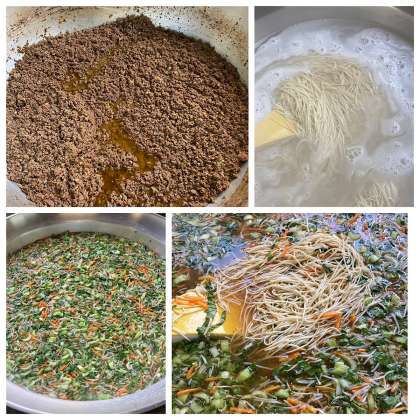 「タンタンめん」は、豚骨スープを使用し、チンゲンサイ、もやし、にんじんを使った汁めんに、ひき肉、白ねぎ、しょうが、にんにくをごま油で香りよくいため、テンメンジャンや赤みそなどで味つけした肉みそを配食時にのせて食べます。