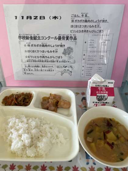 この献立は、令和4年度学校給食献立コンクール優秀賞に選ばれた献立です。児童が考えたねらいは「少し寒くなる時期に、風邪をひかず、体を温め、元気に過ごせる献立」です。