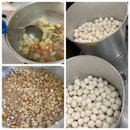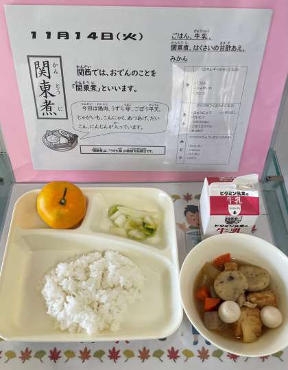 「関東煮」は、鶏肉、うずら卵、ごぼう平天、じゃがいも、こんにゃく、あつあげ、だいこん、にんじんを使用しています。。この献立は、【うずら卵】の個別対応献立です。