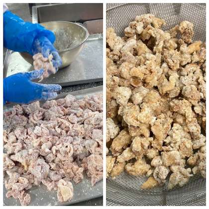「あげどりのねぎだれかけ」は、鶏肉に料理酒、しょうが汁で下味をつけ、でん粉をまぶし、なたね油であげ、白ねぎ、砂糖、米酢、こいくちしょうゆ、ごま油を合わせたタレをからませます。