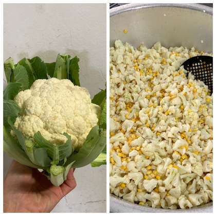 「カリフラワーのピクルス」は、ゆでたカリフラワーとコーンを砂糖、塩、ワインビネガーで作った調味液につけます。