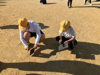 虫メガネで太陽の光を集めています。紙から煙が出て来ました。