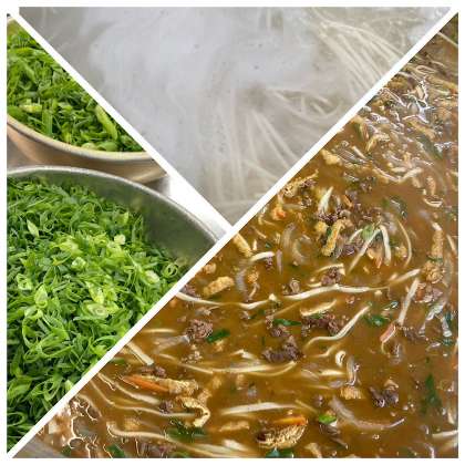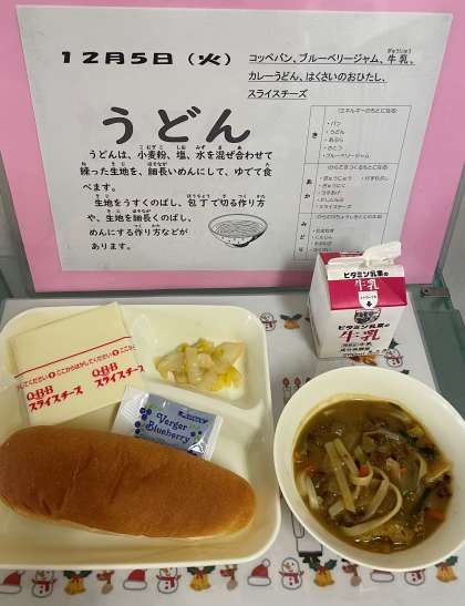 「カレーうどん」は、牛肉を主材に、うすあげ、たまねぎ、にんじん、青みに斜め切りの青ねぎを使用しています。寒い時期に体の温まる一品です。