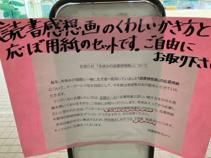 読書感想画の募集をしています。冬休みにお気に入りの本の読書感想画に挑戦しましょう。