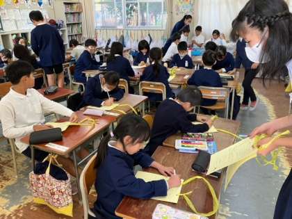 明日の学校まつりの準備を縦割り班でしています。