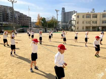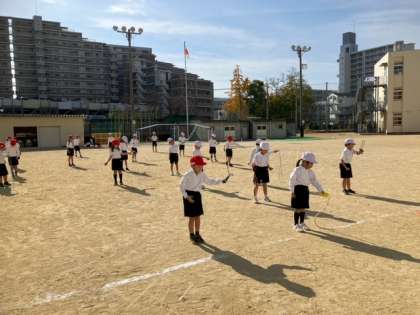 なわとびがうまく跳べるように、なわを回す練習から始めています。