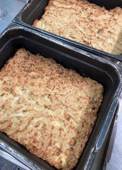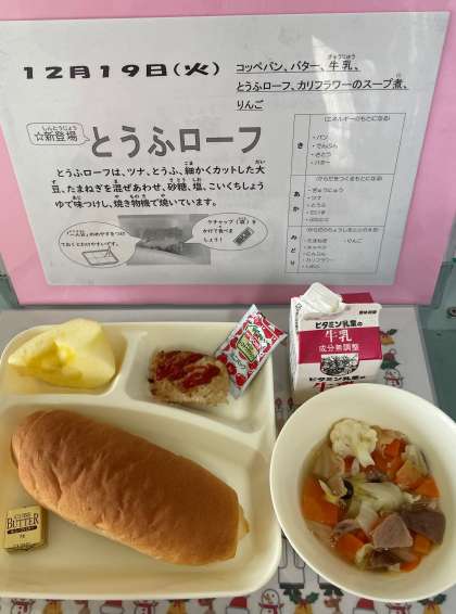 「とうふローフ」は、学校給食献立調理検討会議で開発された新献立です。ツナ、でん粉、粗みじんに切ったたまねぎ、調味料を練るようによく混ぜあわせ、さらに、大切りのとうふ、大豆(粒状)を加えて混ぜ、ミニバットに入れて、焼き物機で焼きます。これにケチャップが1人1袋つきます。