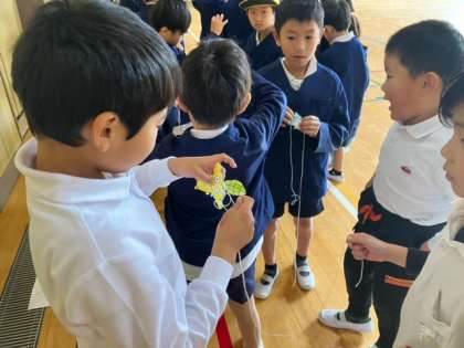 2年生が手作りのゲームをつくり、1年生を招待しました。楽しく一緒に遊びました。