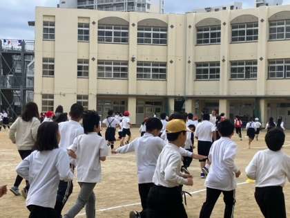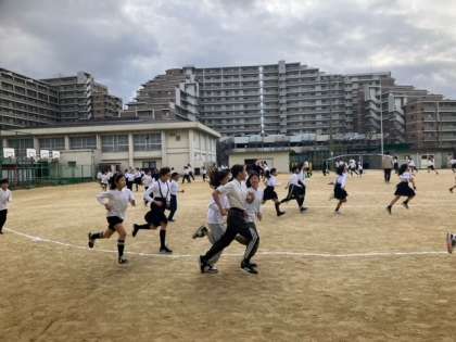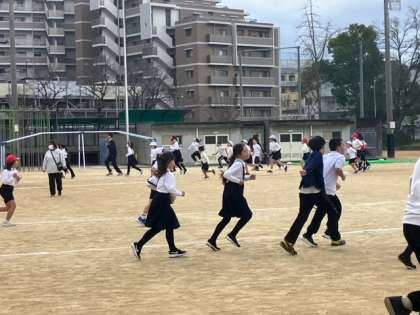 みんな寒さに負けず、元気に走っています。先生たちも頑張って子どもと一緒に走っています。