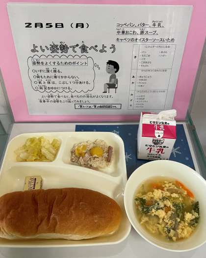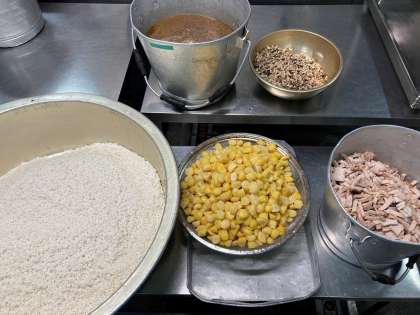 「中華おこわ」は、もち米に焼き豚、くり、しいたけ、調味料を加えて、焼き物機で蒸し焼きにします。チキンブイヨンとごま油でコクと旨みを出した児童生徒に人気の一品です。