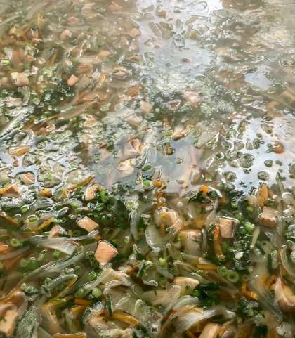 「船場汁」は、本来はさばを使用しますが、給食ではさばの代わりにさけを使用し、ほかにだいこん、たまねぎ、にんじん、青みに青ねぎを使用し、塩、うすくちしょうゆで味つけします。