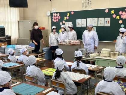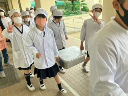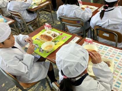 1年生は初めての小学校の給食なので、6年生が食器やおかずを運んで、お手伝いしてくれました。