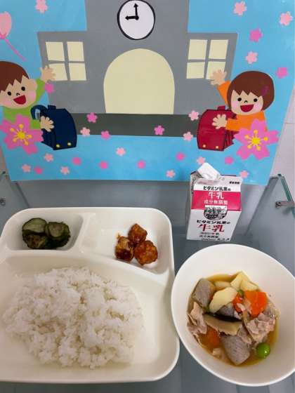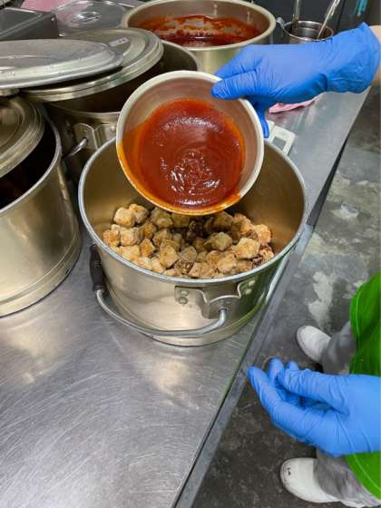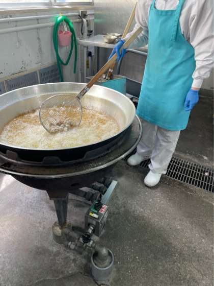 子どもたちに大人気のまぐろのオーロラ煮は、下味をつけ、衣をまぶして油であげたまぐろにケチャップ、砂糖、赤みそで作ったタレをからませて仕上げています。