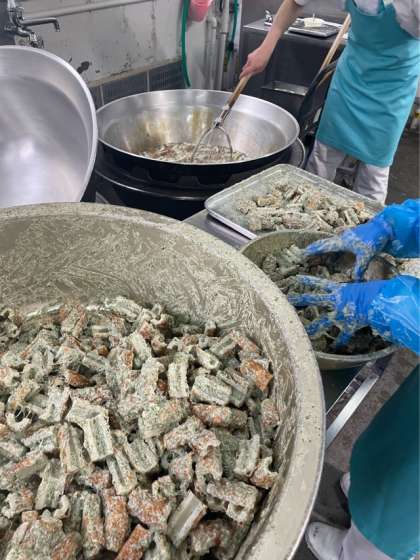 ちくわのいそべあげは青のりを加えた衣をちくわにつけ、油でカラッと揚げています。