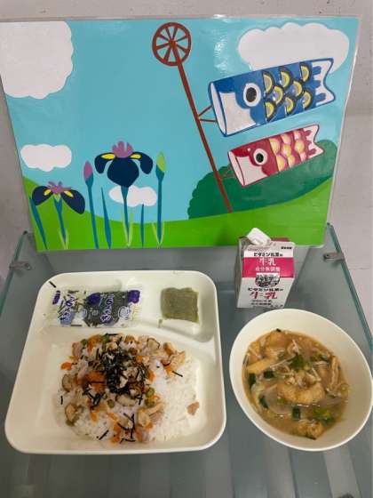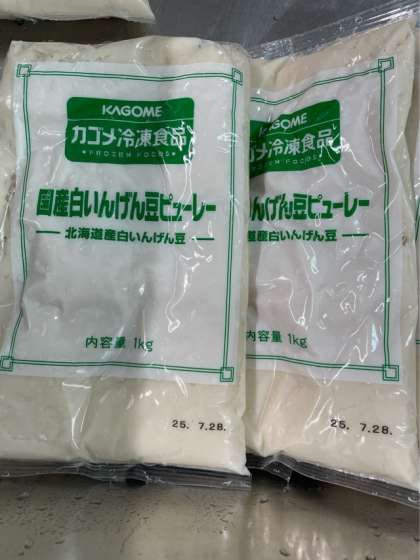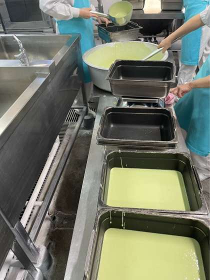 デザートには新茶の季節に合わせて、まっ茶ういろうが出ました。上新粉・砂糖・まっ茶・白いんげんペースト・水をまぜてオーブンで蒸しています。