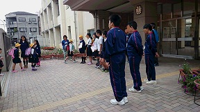 今朝は、職場体験に来た中学生も参加して、玄関であいさつをしていました。