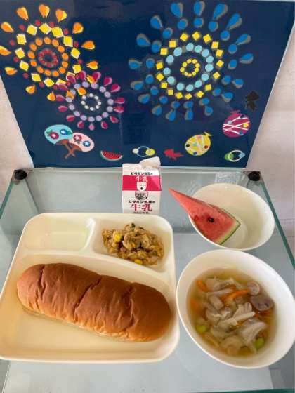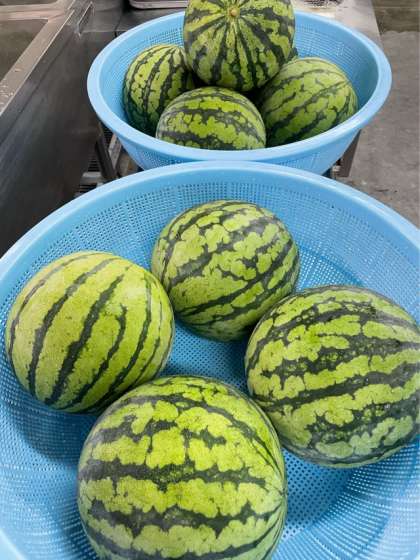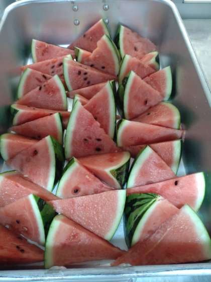 鳥取県からすいかが届きました。給食室では甘味が均等になるよう1玉を64等分に切り分けています。