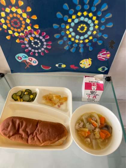 ベーコンとじゃがいものチーズやきは、チーズをのせてオーブンでこんがり焼きあげています。塩加減がちょうどよく、パンによく合い子供たちにも人気がありました。
