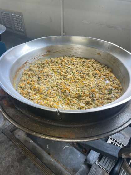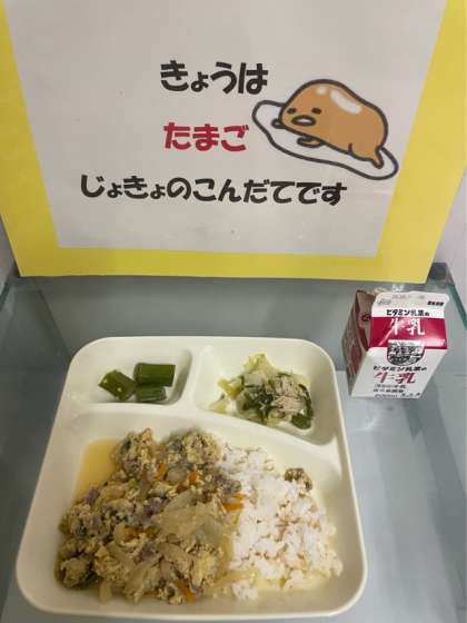 他人丼は、卵除去献立です。調理行程で卵を入れる前にとりわけることで、卵アレルギーのある児童も食べることができます。