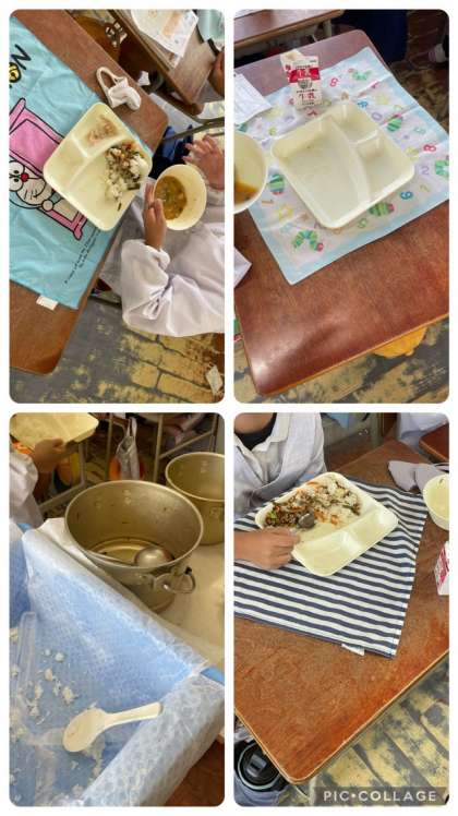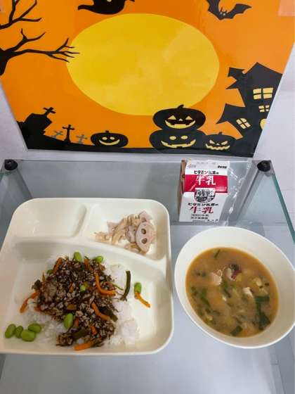 ジューシーは沖縄県で昔から食べられてきた料理の一つです。給食では、もずくなどを使用した炊き込みごはん風でいただきました。