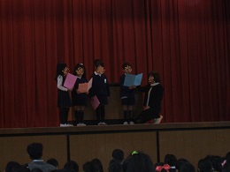 講堂で2年生の4人の代表が、2学期に頑張ったことを発表しました。