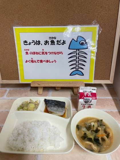 さごしのしょうゆだれかけは、オーブンで焼いたさごしにしょうゆとみりんで作ったタレをかけています。子どもたちは骨に気を付けながら上手に食べていましたよ。