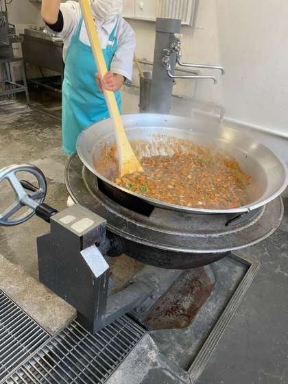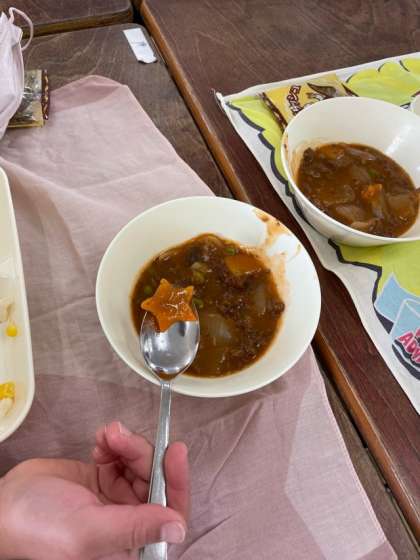 ビーフシチューは子どもたちに大人気の献立です。小麦粉アレルギーの子どもたちも食べることができるよう、上新粉を使用しています。