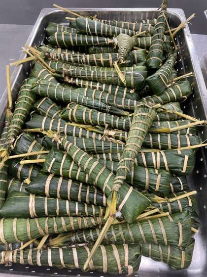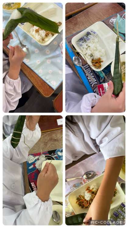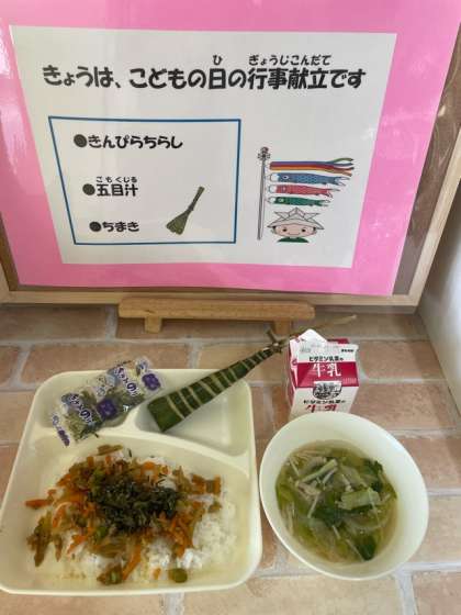 大阪市の給食では、こどもの日の行事献立に「ちまき」がつきます。はじめて食べたという子どもたちもいましたが、上手に笹の葉からおもちを取りだしおいしそうに食べていました。