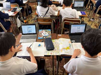地図帳とタブレットを使って、日本の国土についてたくさんのことを調べていました。書く量も多く、さすが高学年です。