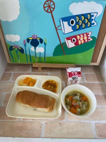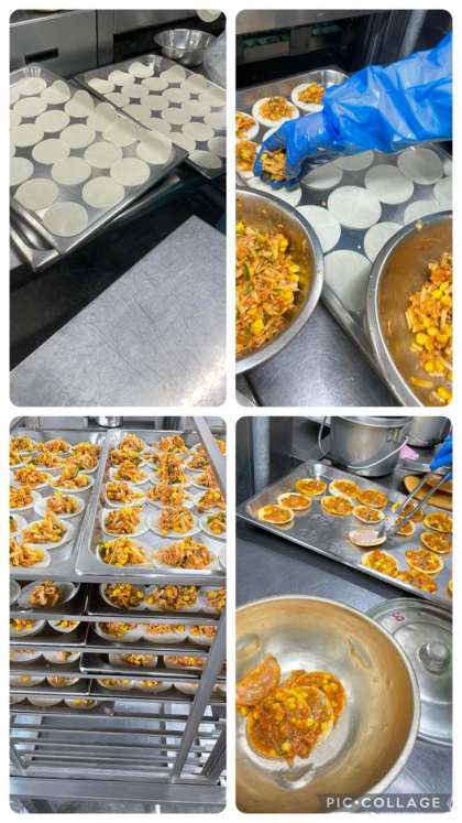 今日は子どもたちに大人気の『変わりピザ』です。変わりピザはチーズを使用しているため、乳アレルギーのある子どもたちは食べることができなかったのですが、今日は原材料に乳を使用していない乳なしチーズを使用し、乳アレルギーのある子どもたちも食べることができます。