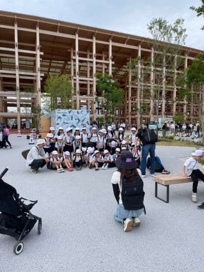 大屋根リングをバックに記念写真