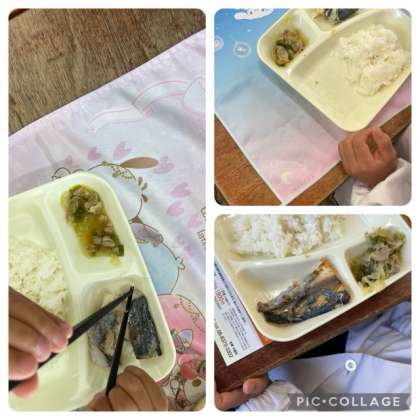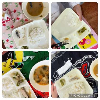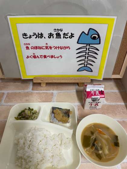 1年生にとって初めての焼き魚です。魚は食べるのが難しく苦戦する献立ですが、上手に骨を取って食べることができました。