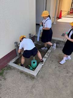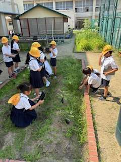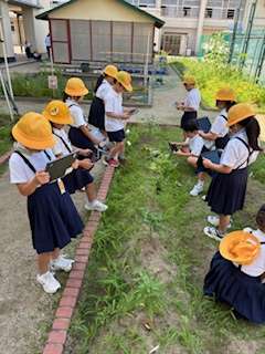 植物の観察をしていました。タブレットが写真を撮ったり感想を言い合ったり、学びを深め合っていました。