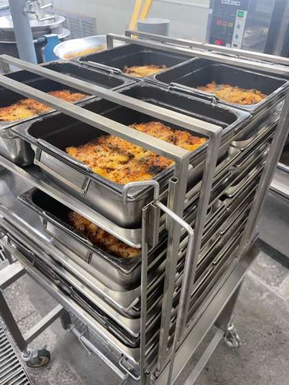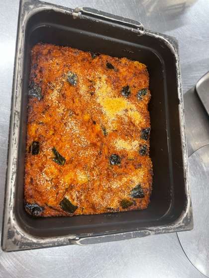 オーブンでこんがり焼いたケチャップ味のかぼちゃのミートグラタンは、子どもたちに大人気でした。